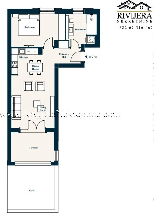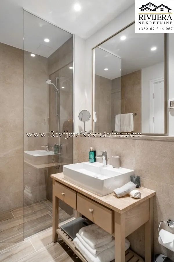 Eine moderne Einzimmerwohnung (Einheit 14-7-01) im Erdgeschoss im exklusiven Viertel Centrale in Tivat steht zum Verkauf.Die Wohnung bietet eine Gesamtfläche von 71 m² (59,87 m² Wohnfläche und 10,83 m² Terrasse) sowie einen 17,90 m² großen privaten Garten und eignet sich somit ideal für komfortables Wohnen das ganze Jahr über oder als Kapitalanlage.