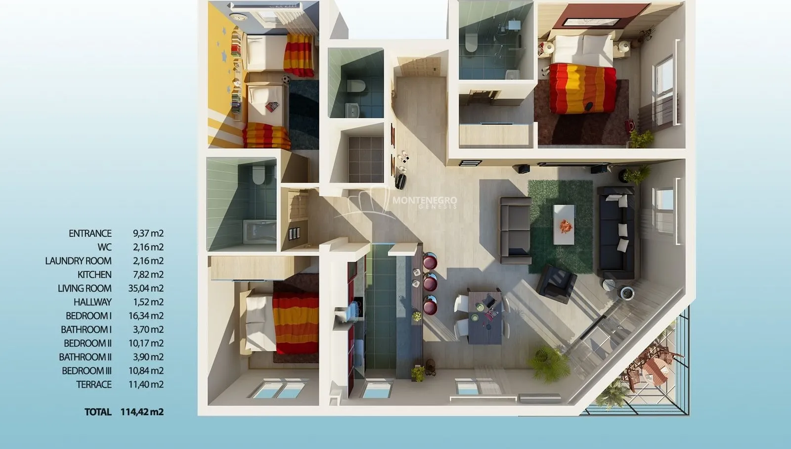 Layout: hallway, living room, kitchen, dining area, three bedrooms, two bathrooms, and a terrace with sea view.