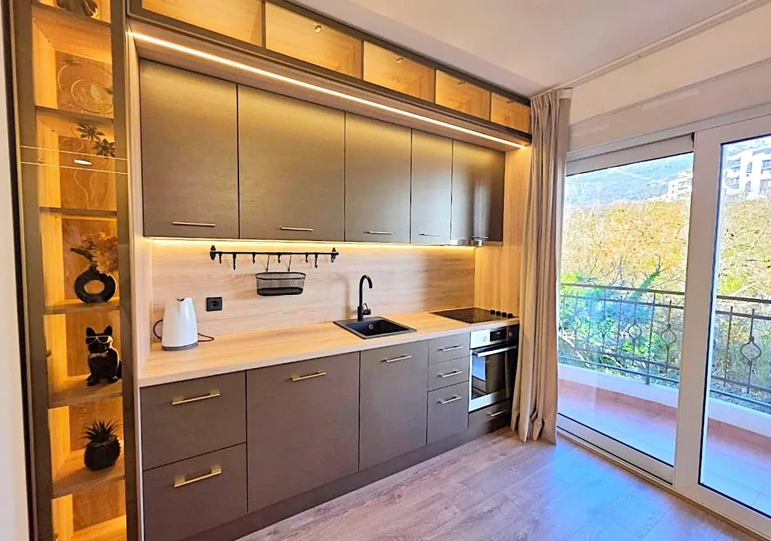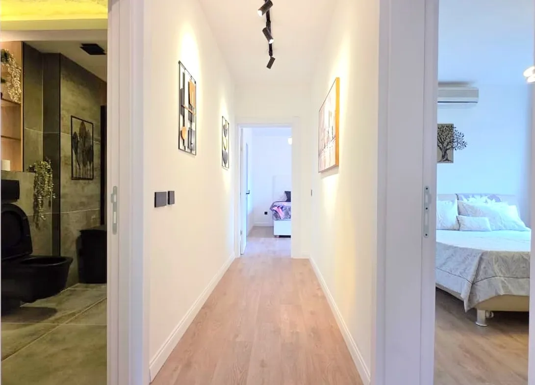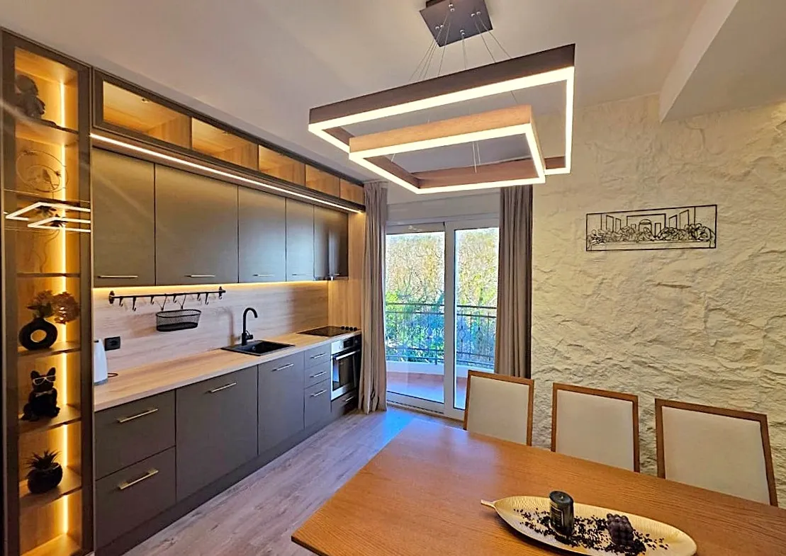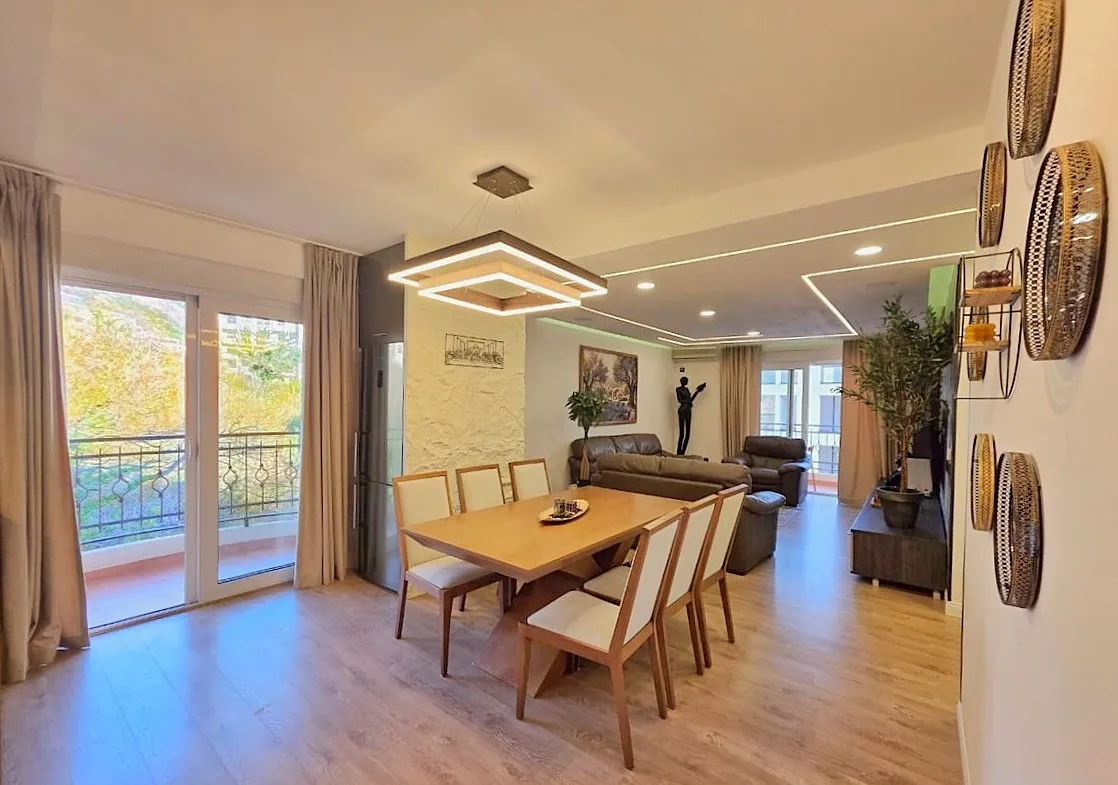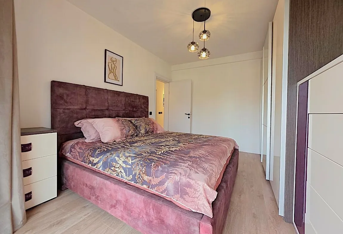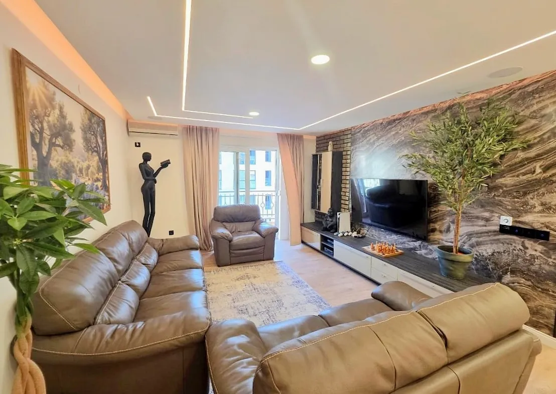 This three-bedroom apartment in Bečići is only 300 meters from the sea, combining modern design, high-quality finishes, and a highly functional layout across 106 m². The apartment features a spacious living room with a dining area and fully equipped kitchen, three bedrooms, two bathrooms, and a private sauna for ultimate relaxation.