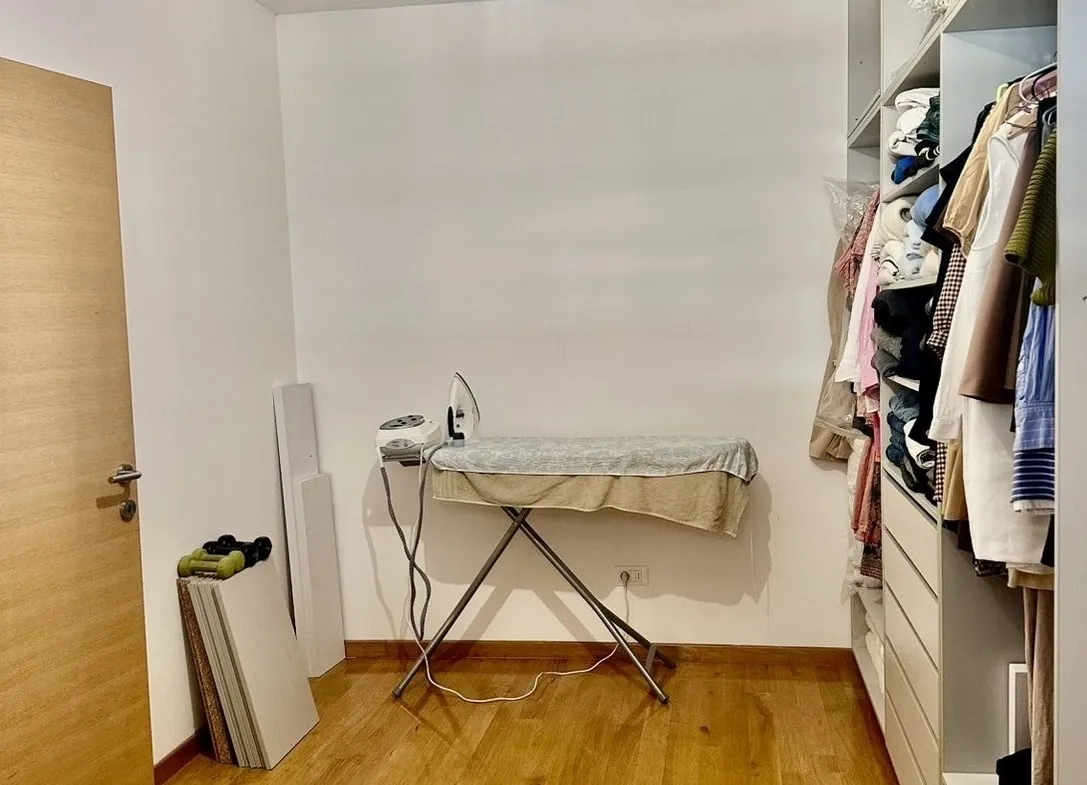 The apartment is partially furnished and includes a garage space, a valuable asset in this busy neighborhood.