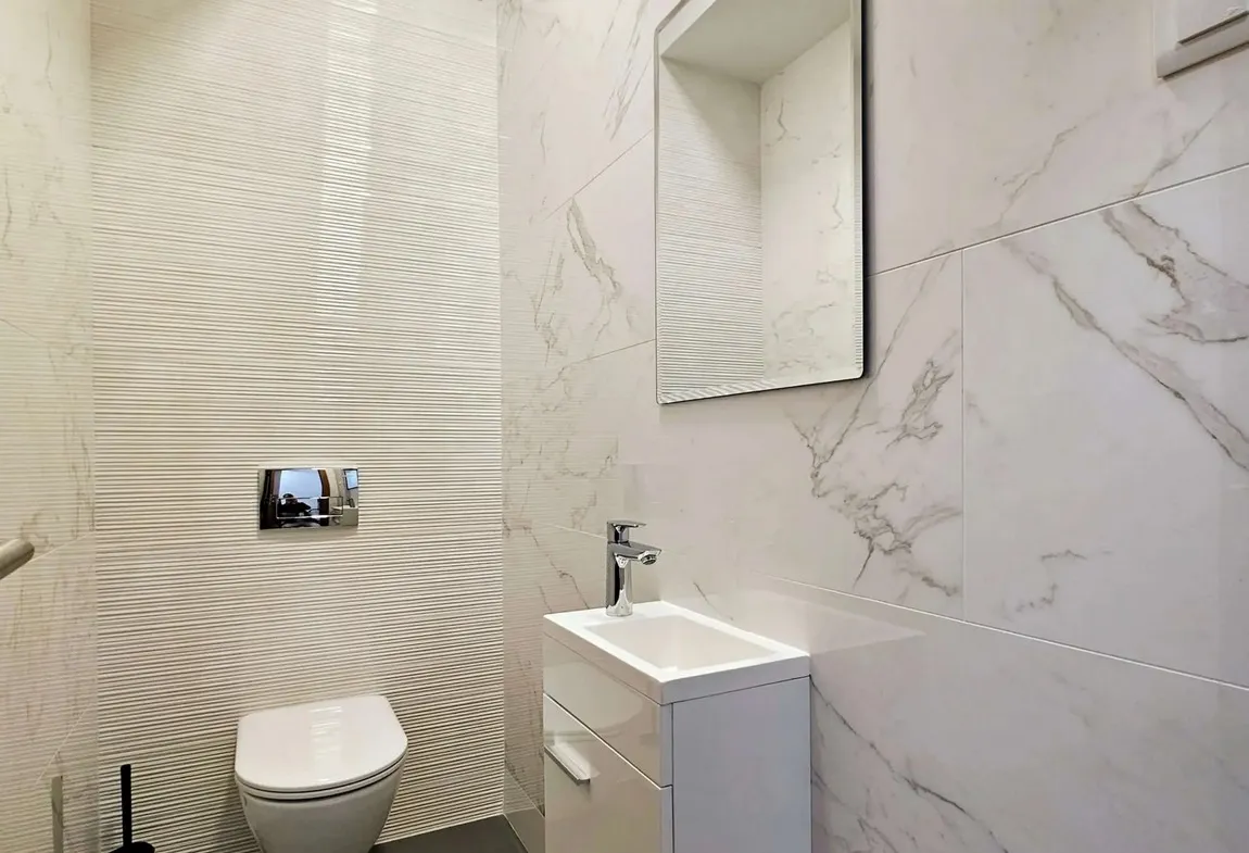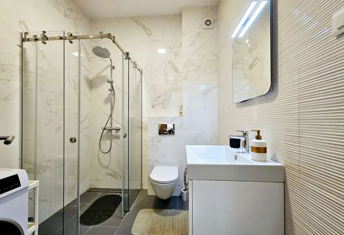 The apartment is located on the third floor with elevator access and has a total area of 73m². It features a bright living room, a fully furnished kitchen, two bedrooms, and two modern bathrooms. The highlight of the property is the terrace, which offers a stunning and uninterrupted view of the Adriatic Sea.