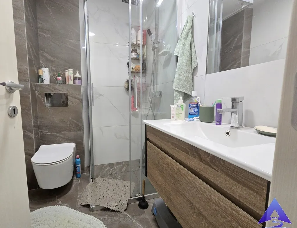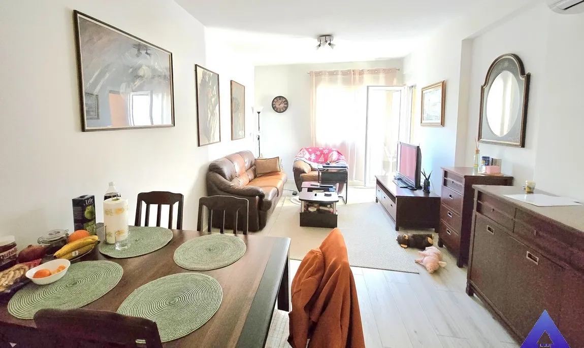 Positioned on the first floor of a residential building with an elevator, the apartment has a registered area of 55m². The total usable space is approximately 60m², as the terrace is not included in the official square footage.