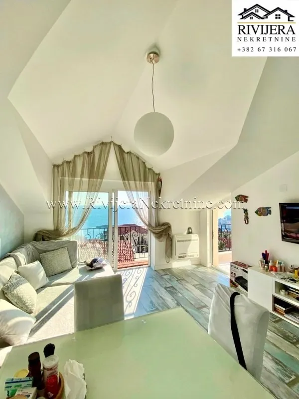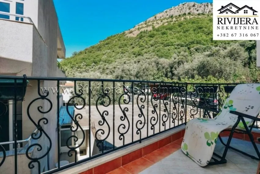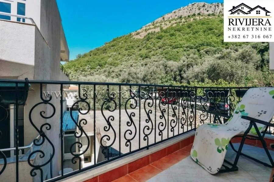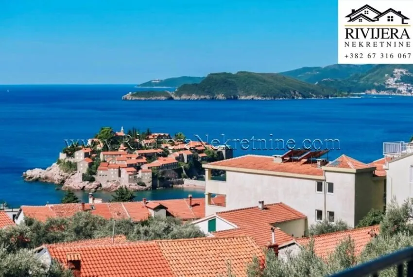 This spacious apartment occupies the entire floor of a three-story building, and from the terrace, it offers a spectacular panoramic view of the sea, mountains, and the magical Sveti Stefan Island.