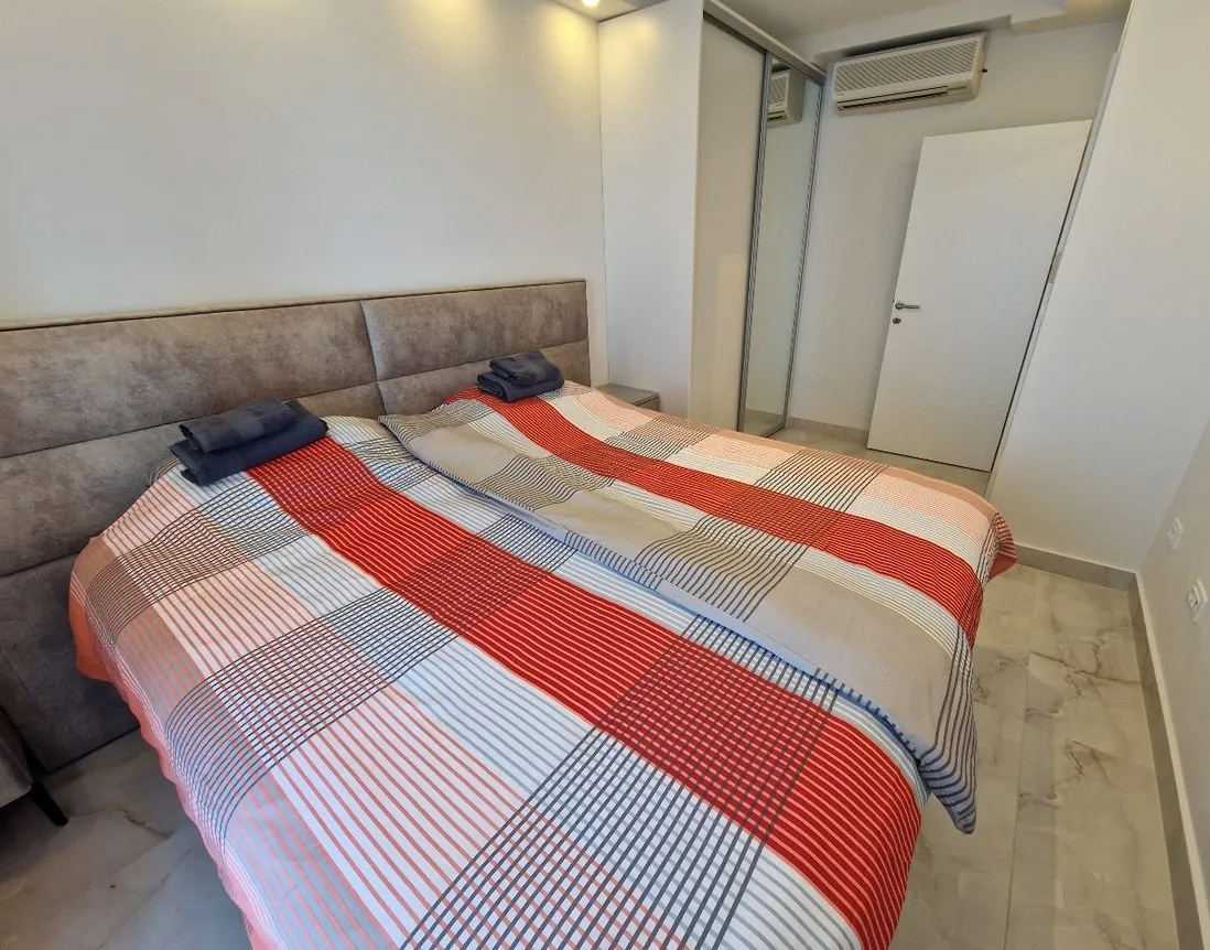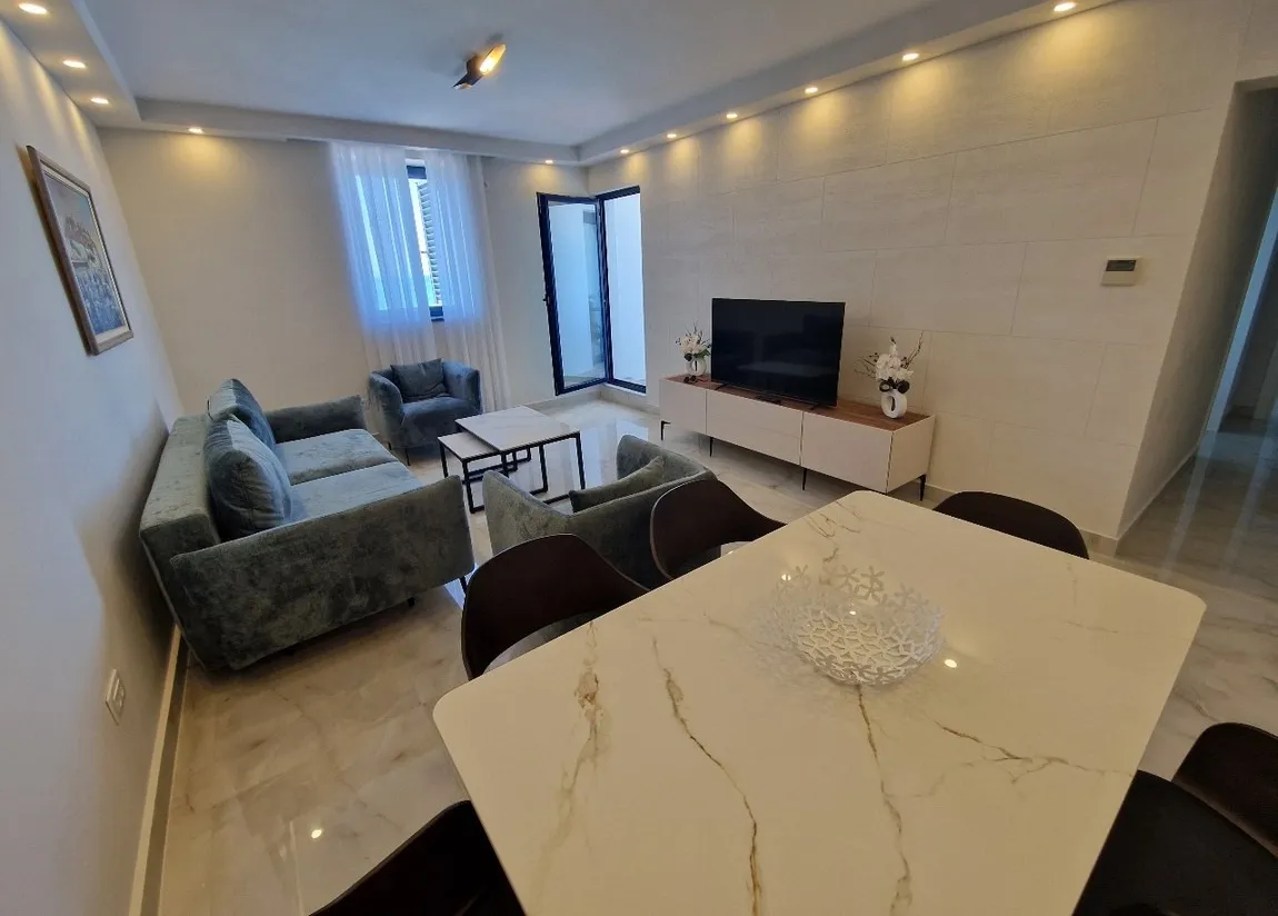 Positioned in the first line to the sea, just steps from the beach, the apartment boasts a breathtaking open view of the Adriatic Sea and the iconic island-hotel of Sveti Stefan.