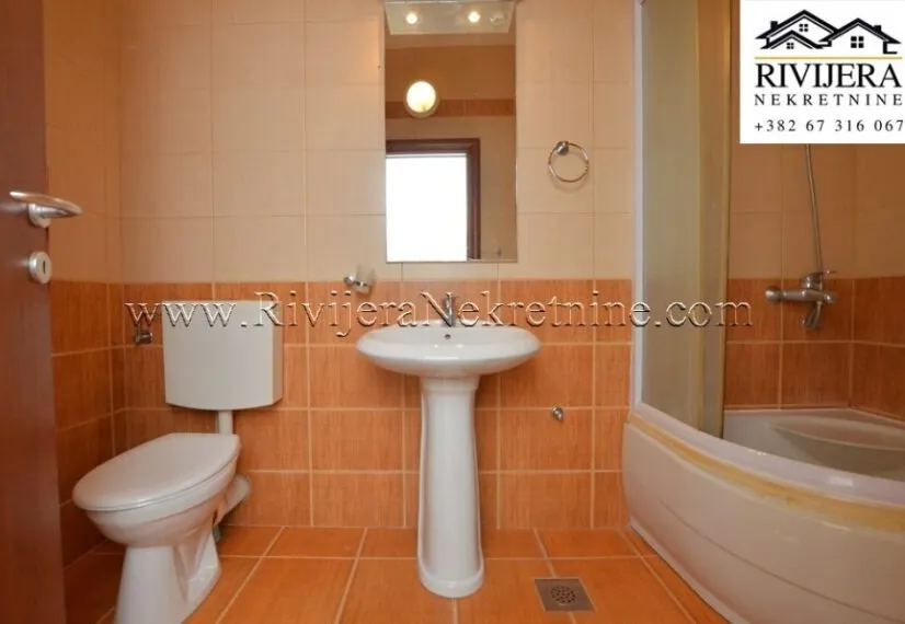 Apartment area 64 m (registered as 62 m), layout: entrance hall, bathroom, two bedrooms, living room with kitchen, terrace (with beautiful sea view, Igalo).