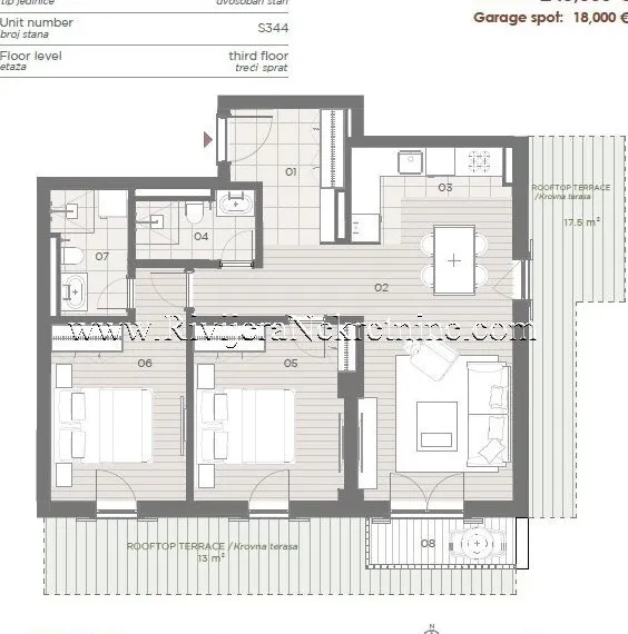 Apartment area 71m, third floor. Room layout: hallway, living room, kitchen, two bedrooms, two bathrooms, terrace.