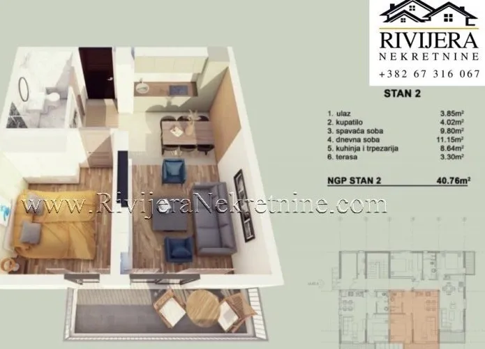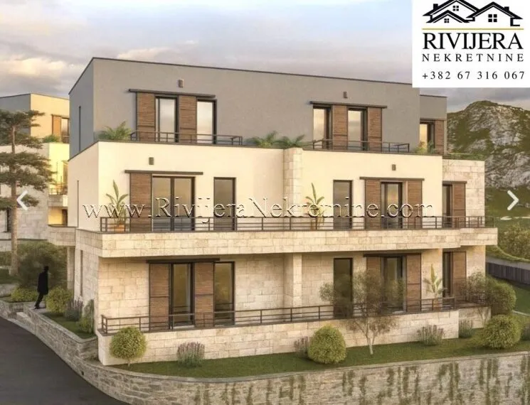 A one-bedroom apartment with a swimming pool view, a total area of 41 m² + 18 m² of private yard for use, is for sale in a unique residential complex located in the peaceful seaside village of Orahovac, Kotor Municipality.