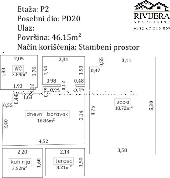 The registered area in the property records is 35 m², while the actual apartment size is 46 m².