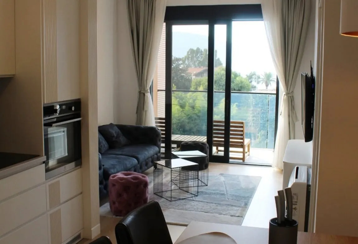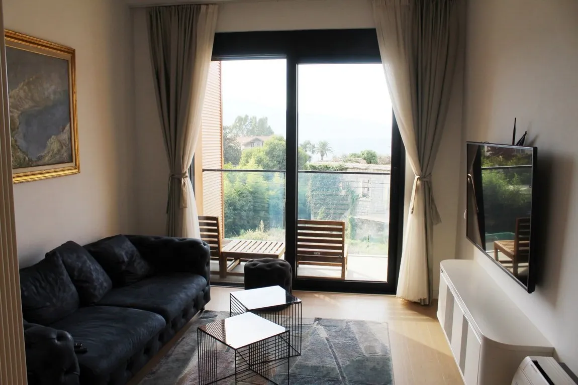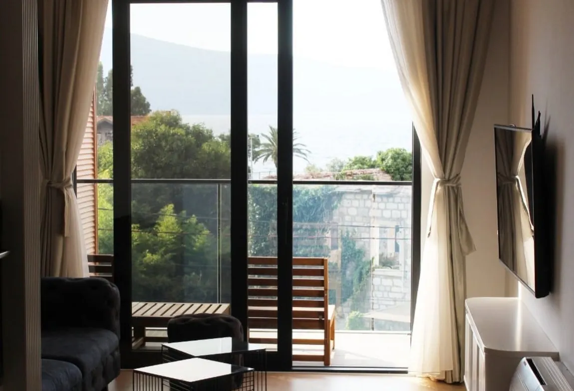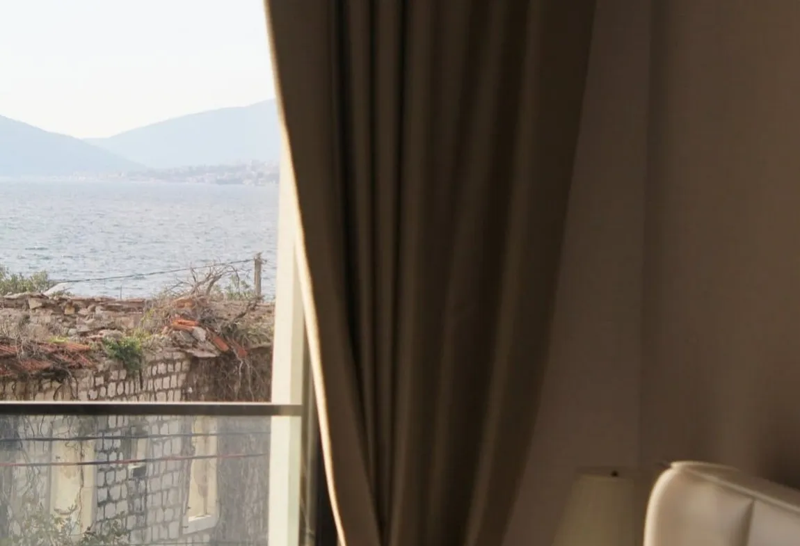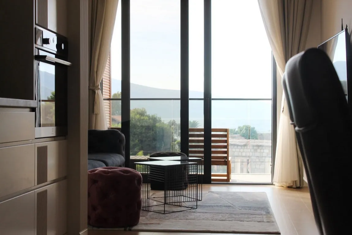 Located in the sought-after neighborhood of Donja Lastva, Tivat, this beautifully furnished one-bedroom apartment offers a rare opportunity to own property just steps from the coast. Set on the second floor of a modern, well-maintained building in the second sea zone, the 56m² apartment features a spacious living area with access to a terrace with a sea view.