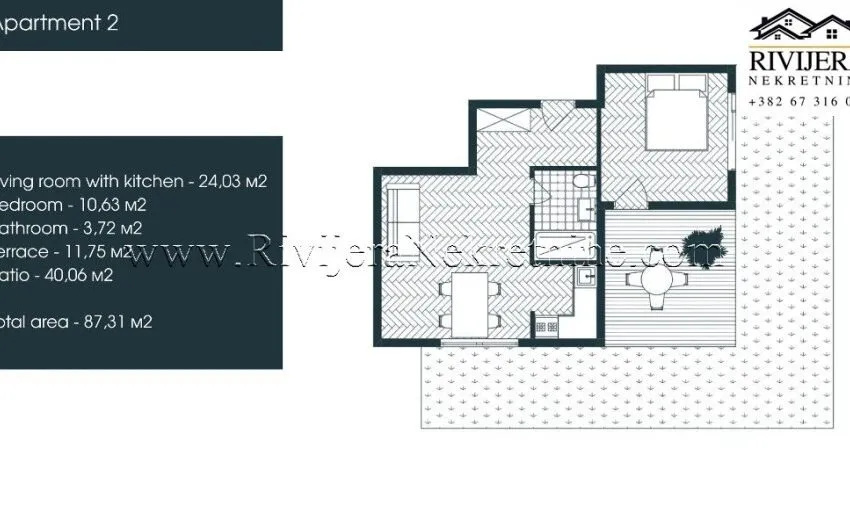 A one-bedroom apartment of 87 m² is for sale, on the first floor in a new residential complex located in one of the most beautiful parts of Tivat – Donja Lastva. The complex is situated in a peaceful area, surrounded by greenery and prestigious residences.