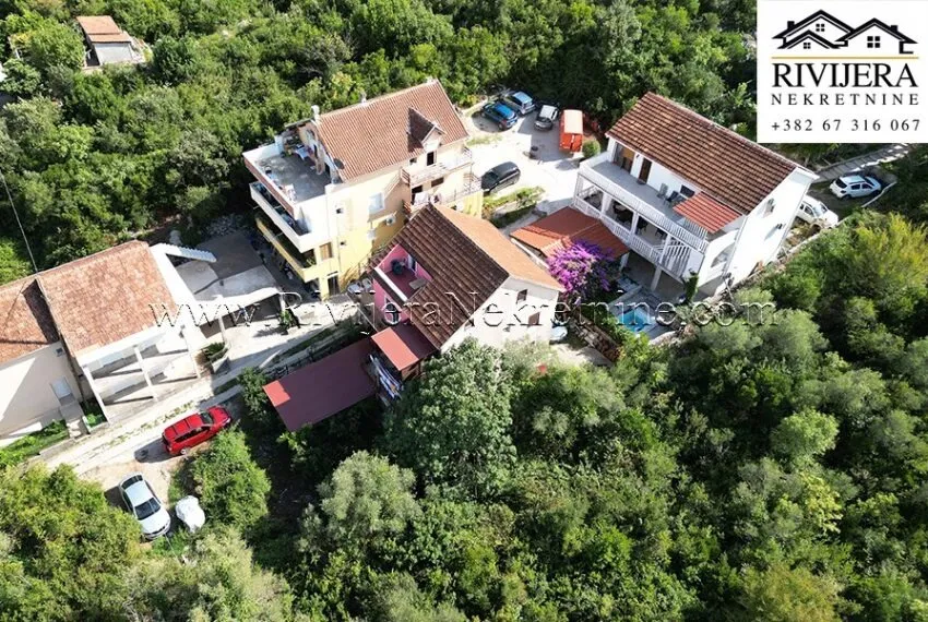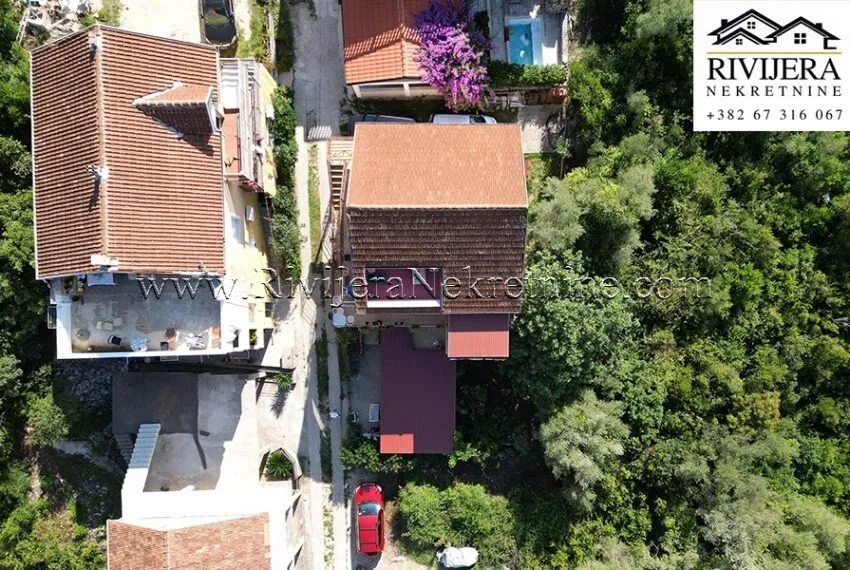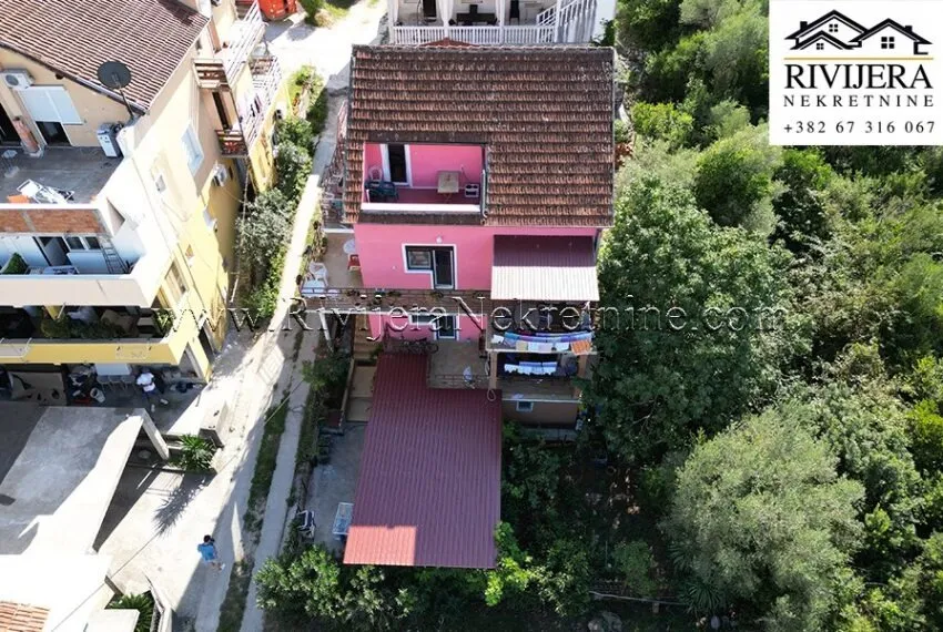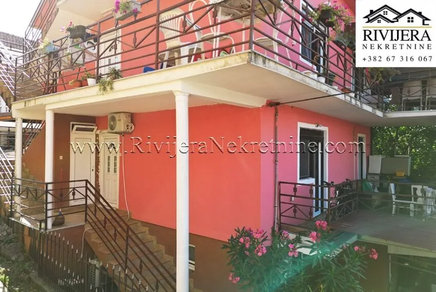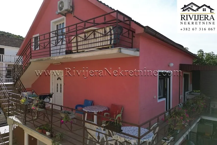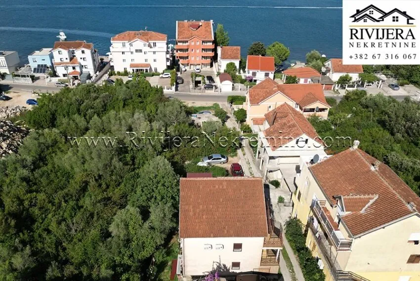 The property consists of a one-bedroom apartment on the ground floor, two two-bedroom apartments on the upper floors, and a finished attic. Each level features a spacious terrace offering stunning views of the bay. The house has road access, electricity, and water supply, and is situated 12 km from Tivat Airport and 15 km from the town center.