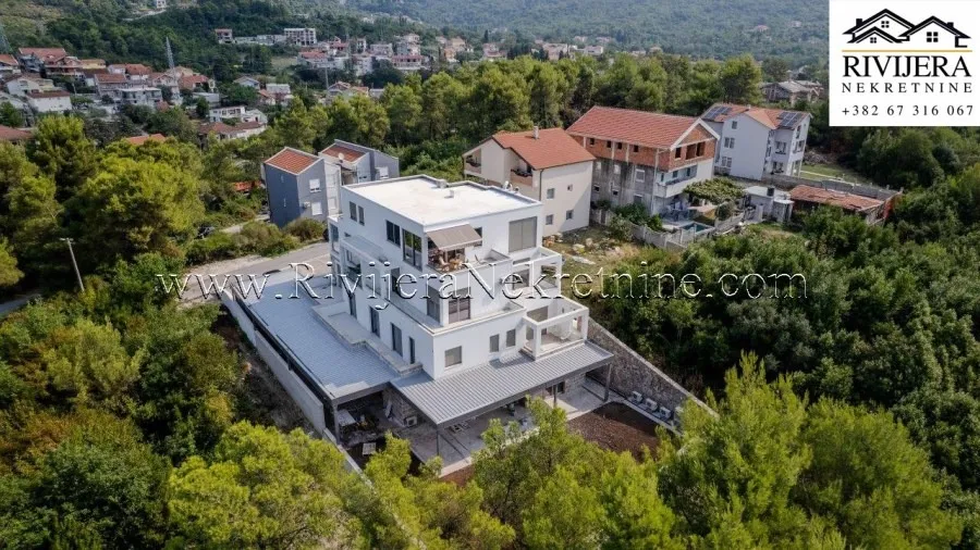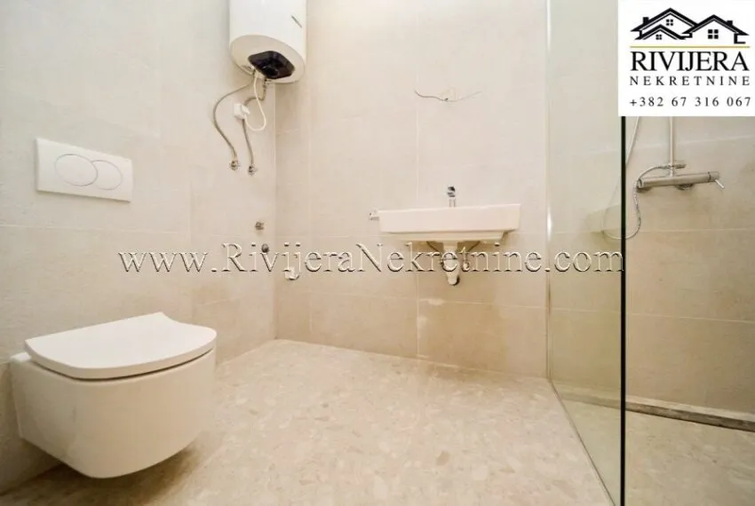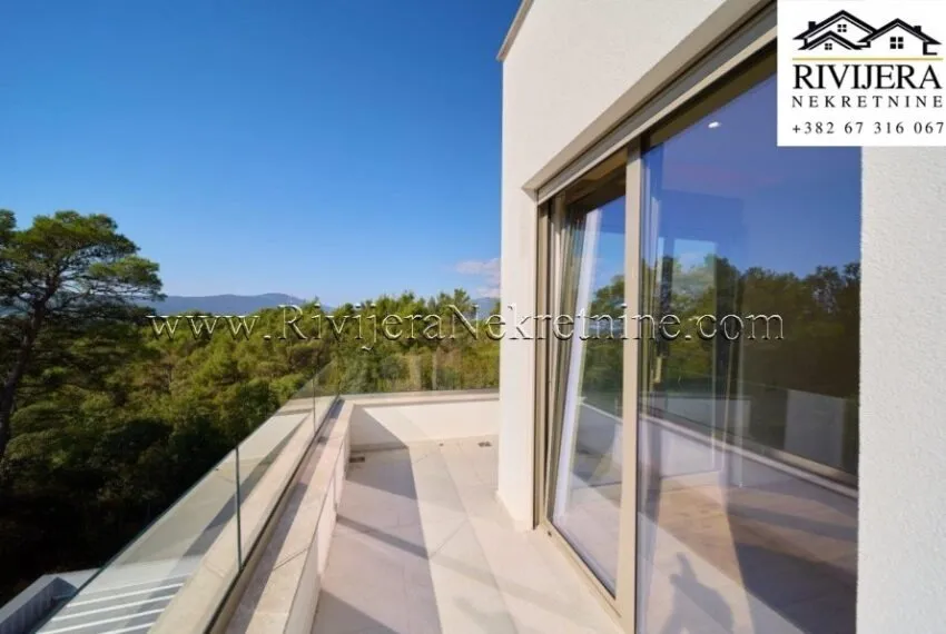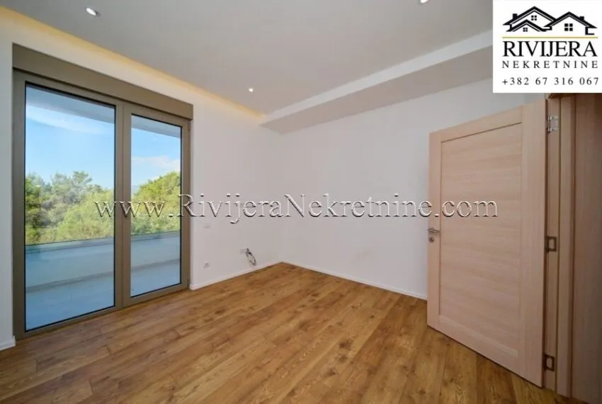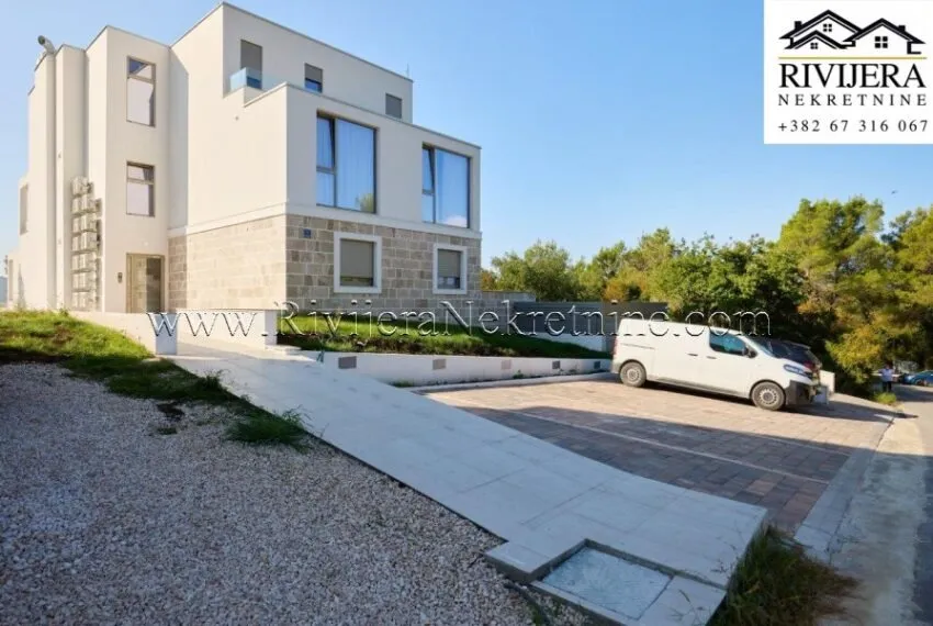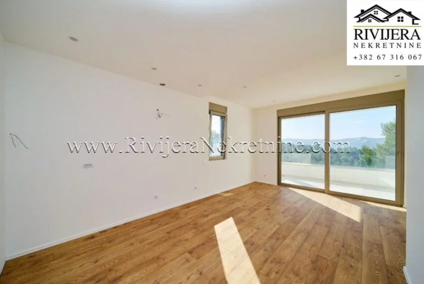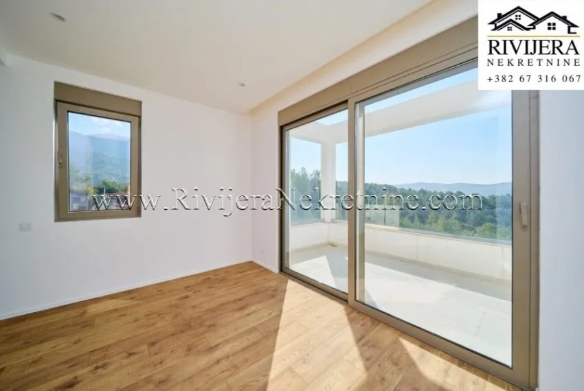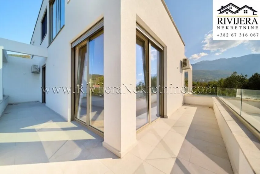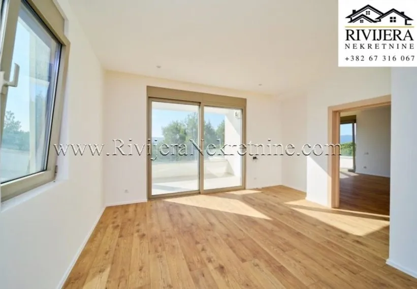 A two-bedroom apartment with a total area of 111 m² is for sale, located on the first floor of a residential building in Mrčevac, Tivat municipality.