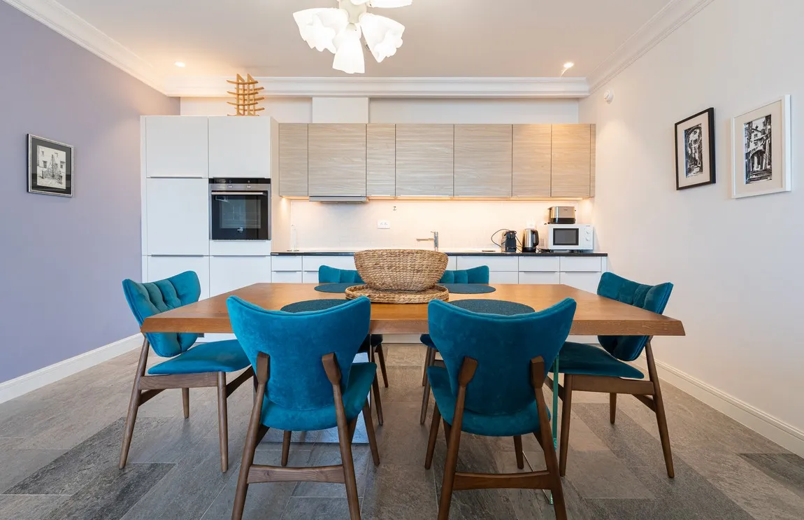 a bright open-plan living room, dining area, and fully equipped kitchen,