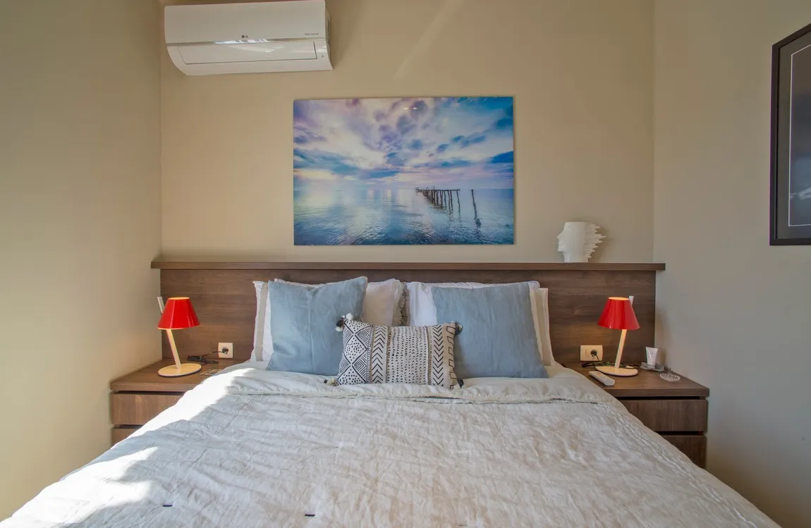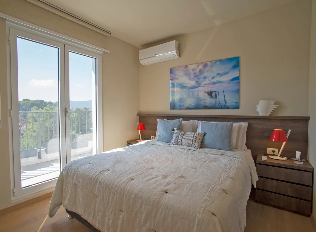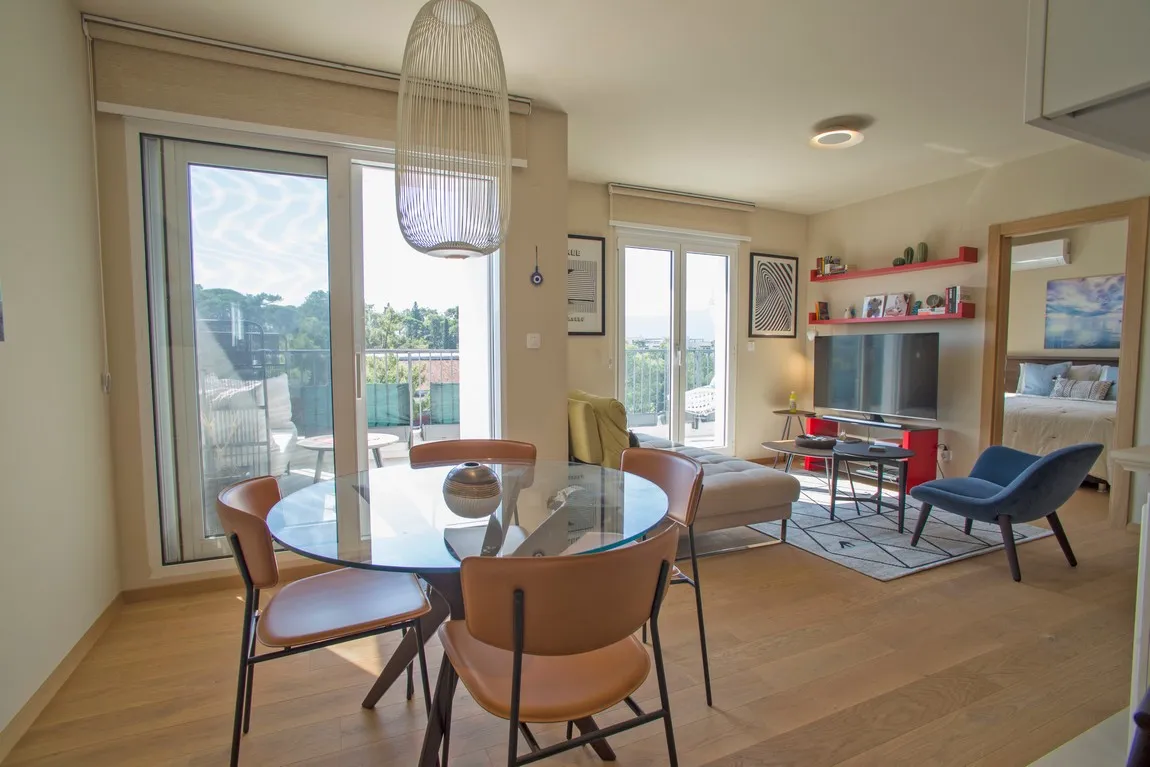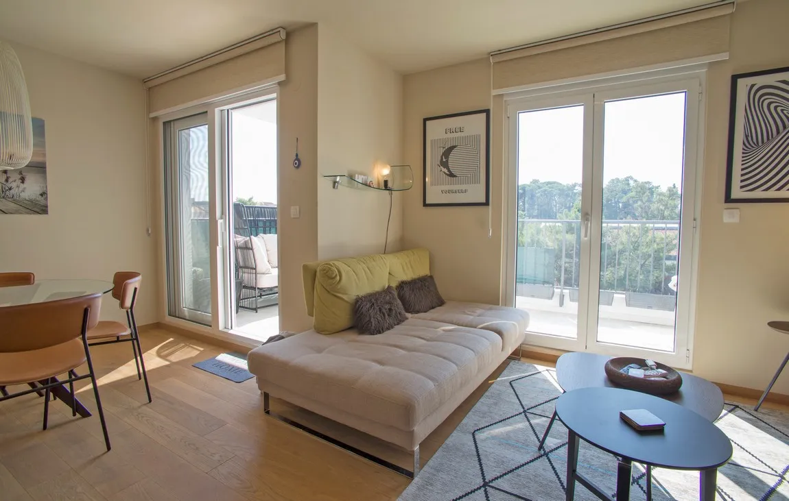 The apartment spans 60m² and includes two bedrooms, one bathroom, and a bright living room with direct access to a terrace offering views of greenery and the sea. The property is sold fully furnished with modern furniture and quality appliances, ready for immediate move-in.