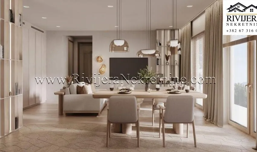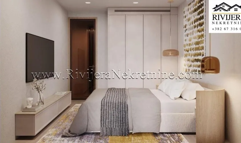 A one-bedroom apartment of 57 m² for sale in a residential complex in Tivat. The complex consists of 10 residential buildings designed with a unique architectural concept, emphasizing details, premium materials, and sophisticated design.