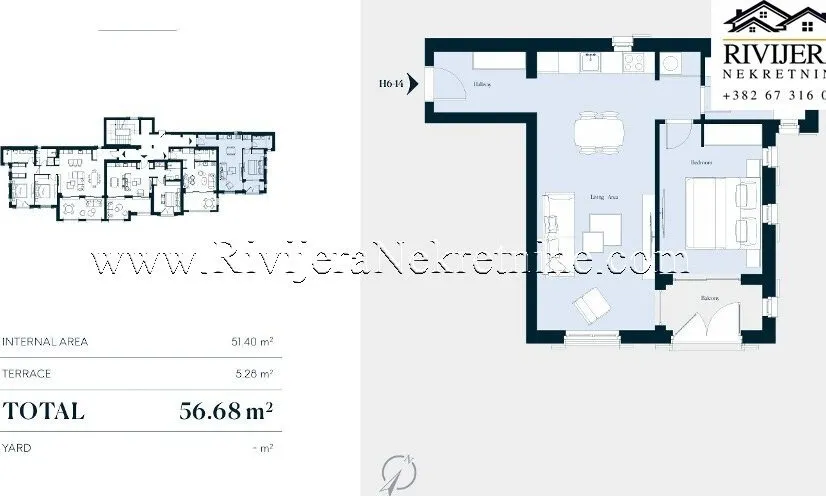 Apartment size: 57 m² (51.40 m² interior space + 5.28 m² balcony).