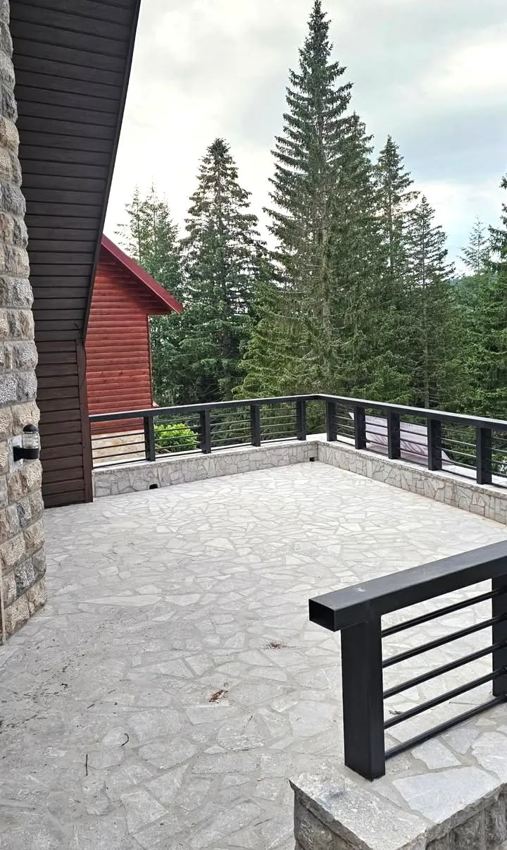 The house also has its own garage and features a total of three terraces, one of which is exceptionally large and offers a beautiful view of the forest and the camp.
