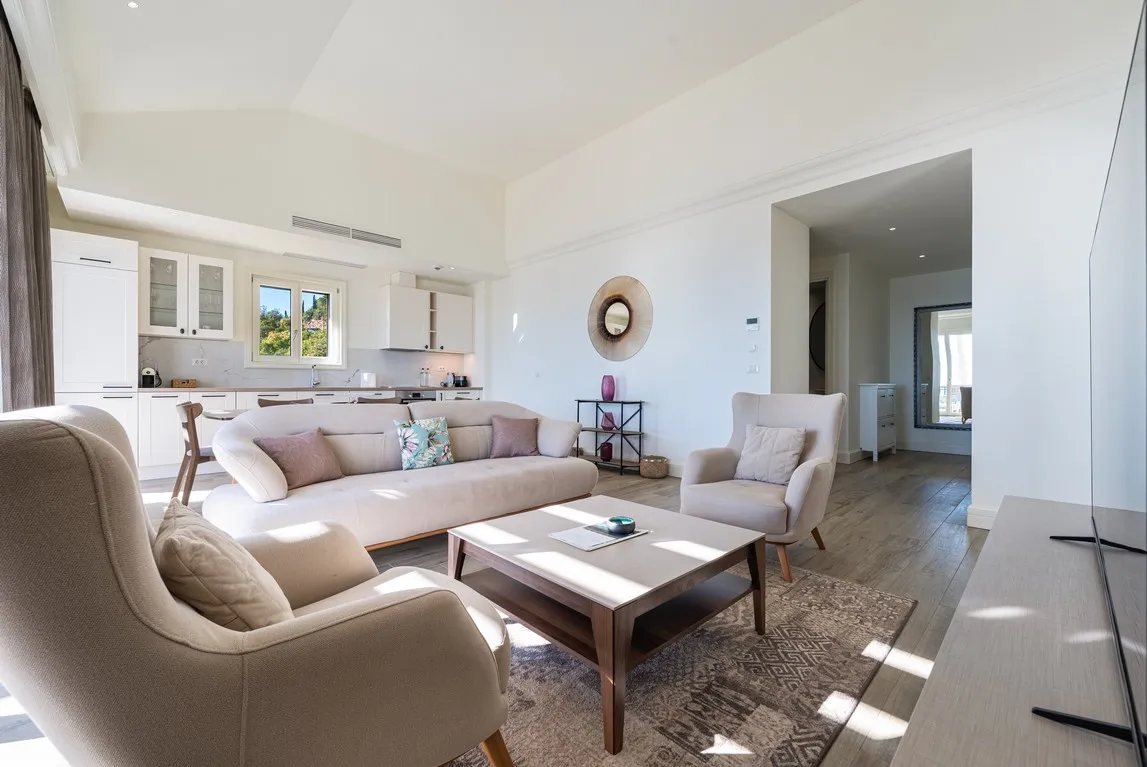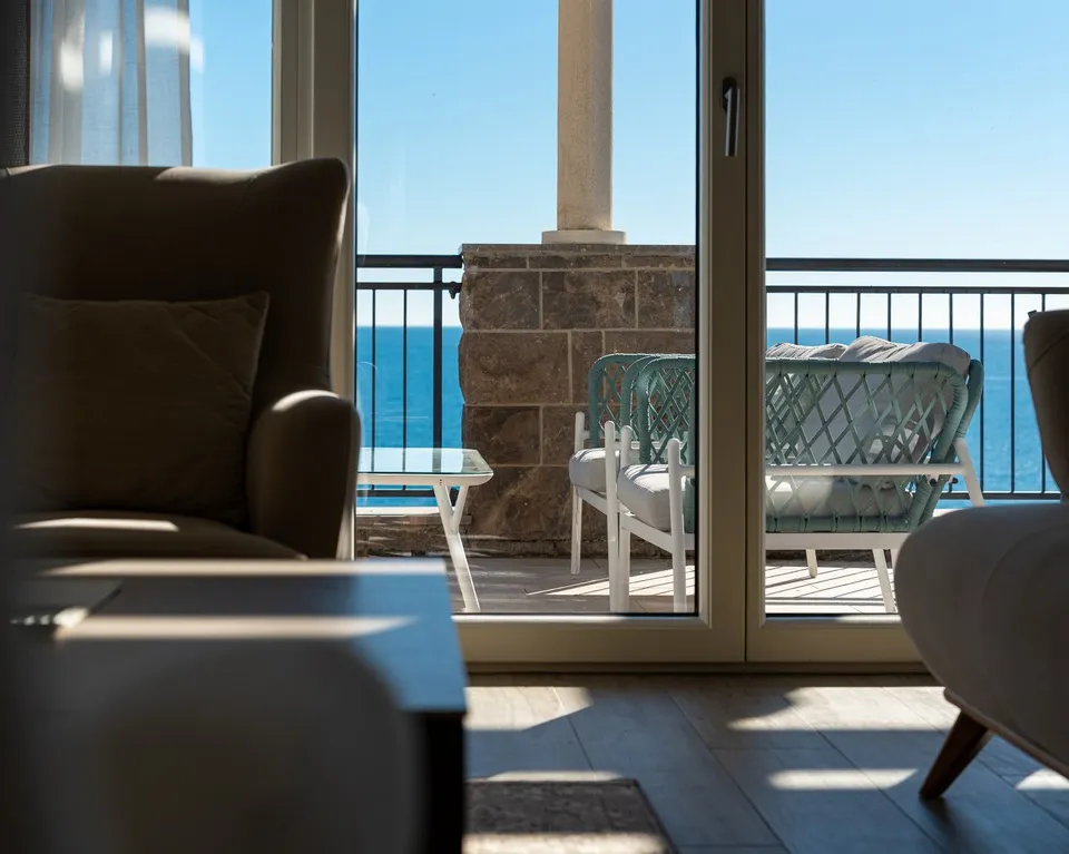 A spacious living room with floor-to-ceiling glass doors and direct access to the terrace