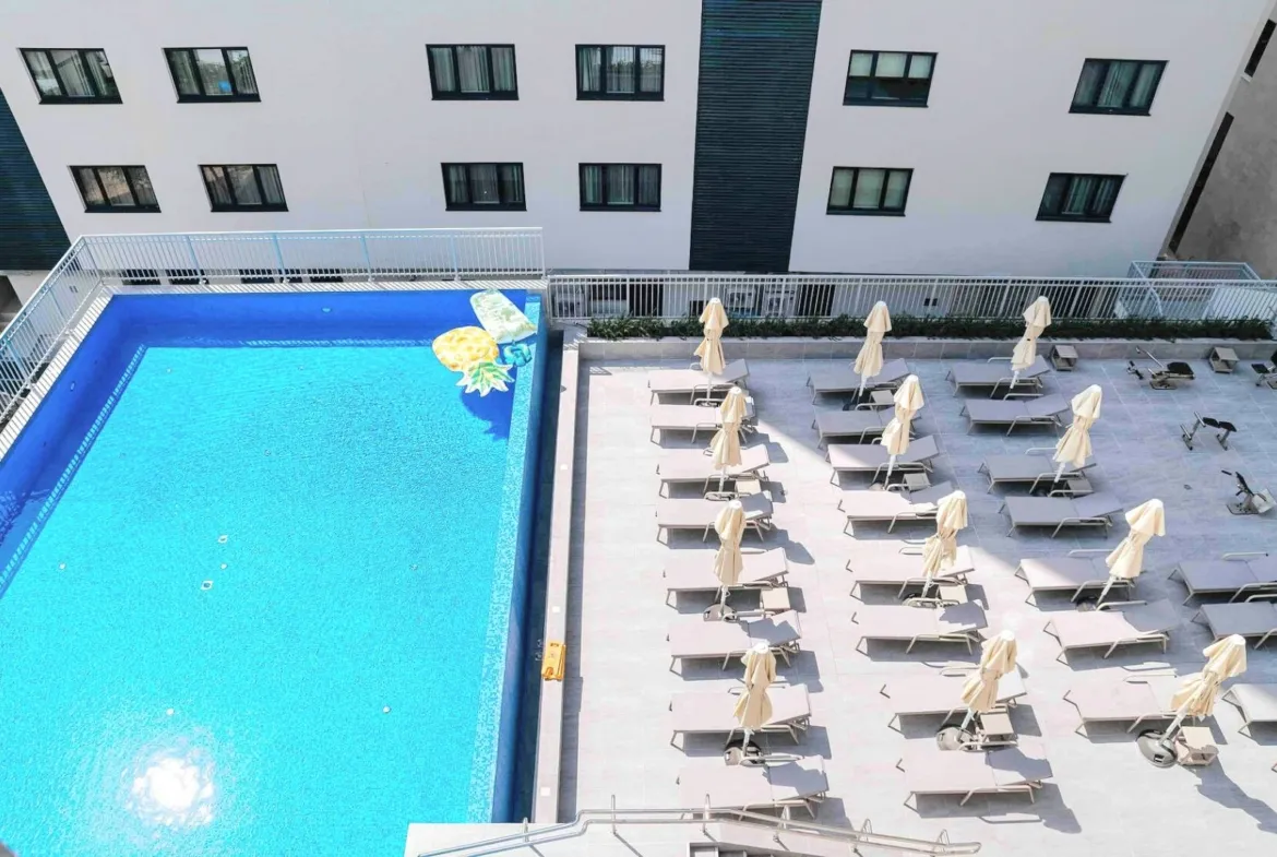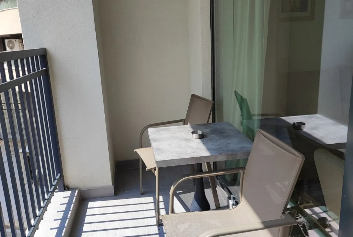 The apartment is located on the fourth floor of a well-maintained residential complex that features a swimming pool, sunbeds, and a gym, creating a mini-resort experience just minute from the beach.
