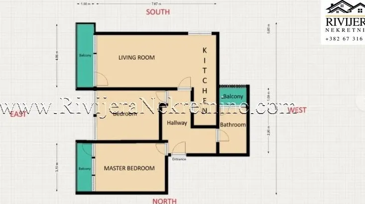 Agencement de l'appartement : hall d'entrée, séjour avec coin repas et cuisine, deux chambres, salle de bains et trois balcons.