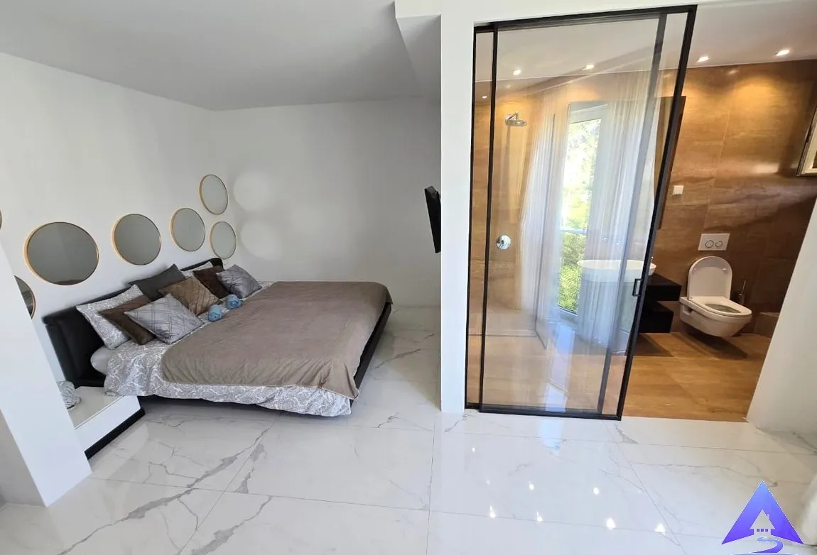 The highlight of this home is its three private terraces. One boasts a private pool, sunbathing deck, summer kitchen, and a stylish lounging area – perfect for entertaining or enjoying serene moments while overlooking the sparkling Adriatic and lush green surroundings. The open-plan living and dining area is flooded with natural light, creating a relaxing and airy atmosphere.