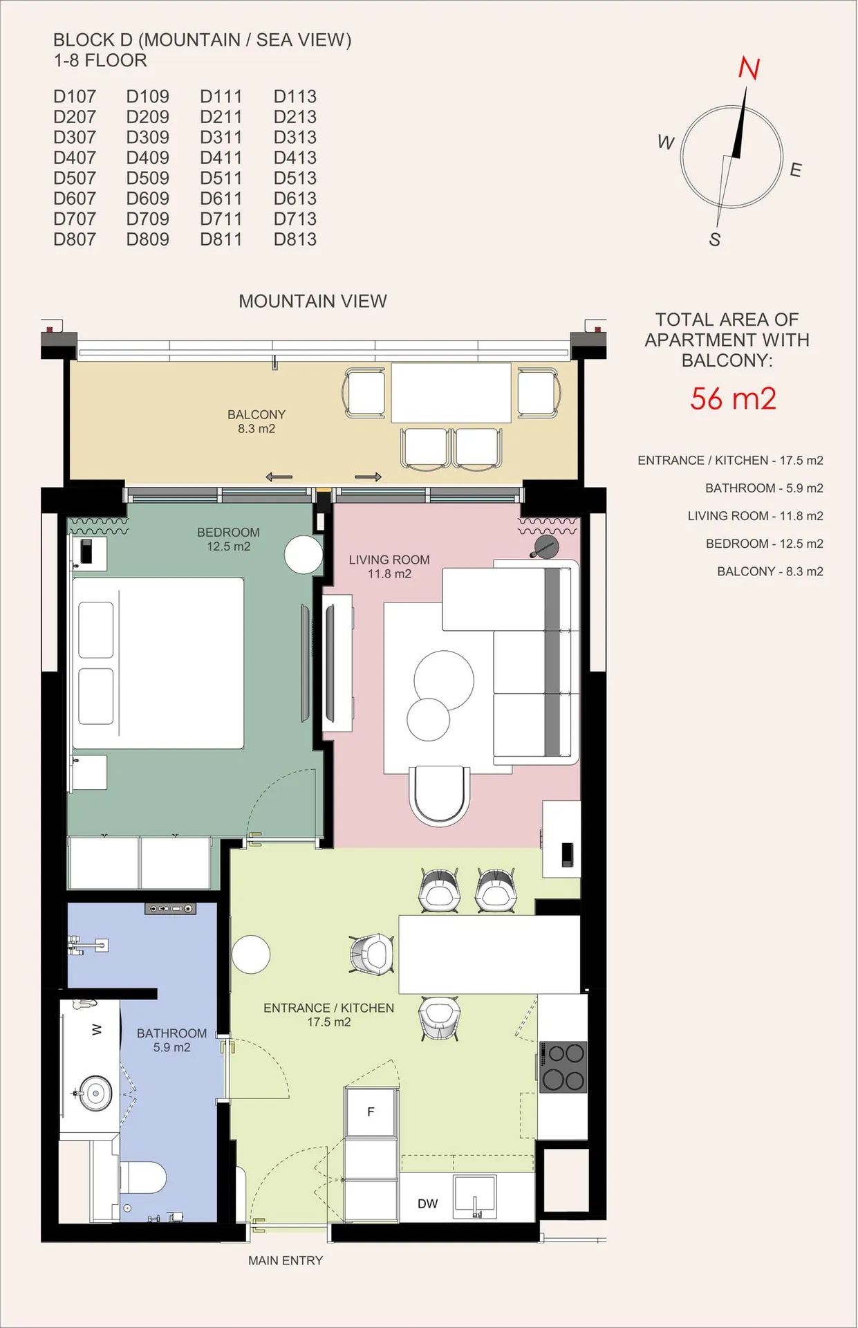 This particular one-bedroom apartment is located on the fourth floor and spans 56m². The apartment does not have a sea view but enjoys an elegant, peaceful setting with abundant natural light. Designed in a Mediterranean contemporary style, it comes fully furnished, featuring bright interiors, modern finishes, and carefully selected materials that create a warm and refined ambiance.