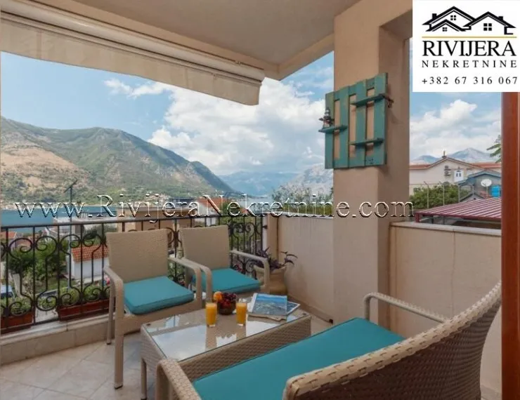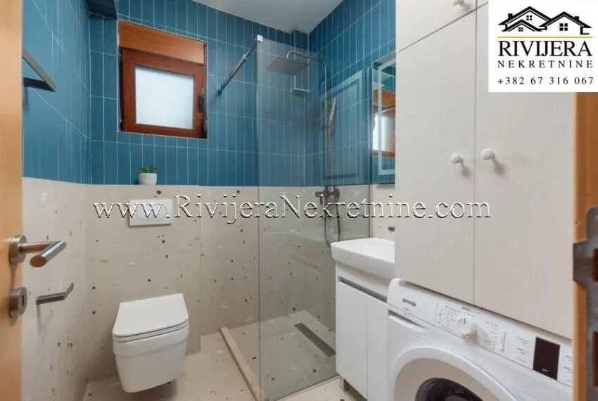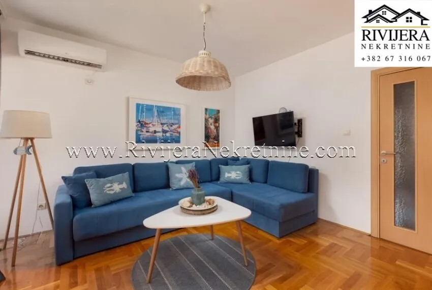 A one-bedroom apartment of 50m² is for sale, featuring a private parking space and an additional external storage unit, located in one of the most sought-after areas of Dobrota.